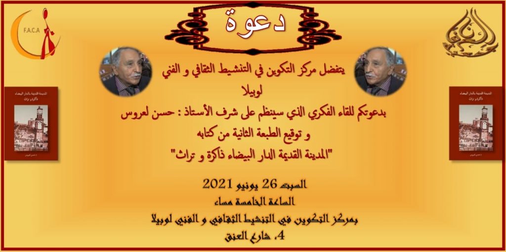 يوقع الكاتب والاديب حسن لعروس بالدارالبيضاء كتابه “المدينة القديمة للدارالبيضاء ذاكرة وتراث” يوم السبت 26 يونيو 2021 بمركز التكوين في التنشيط الثقافي والفني لوبيلا 4 شارع العنق بالبيضاء