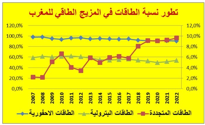 وبالرجوع لتطور حصة الطاقات المتجددة وبما فيها الطاقات الكهرومائية (انظر المبيان)، نجددها لا تتعدى 10٪ من المزيج الطاقي للمغرب في نهاية 2022، واستمرار سيطرة الطاقة الاحفورية، بأكثر من 90٪.