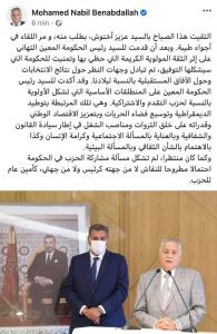في تدوينة على حسابه على الفايس بوك قال نبيل بن عبد الله زعيم حزب التقدم والاشتراكية أن النقاش مع رئيس الحكومة المعين عزيز أخنوش لم يكن نقاشا حول مشاركة الحزب قي الحكومة ولم يكن نقاشا مطروحا لا من جهته كرئيس حكومة ولا من جهتي كأمين عام .