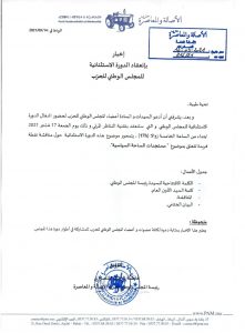 دعت رئيسة المجلس الوطني لحزب الاصالة والمعاصرة أعضاء المجلس الوطني الى دورة استثنائية للمجلس وذلك يوم الجمعة 17شتنبر ابتداء من الساعة الخامسة زوالا وتتمحور حول مناقشة نقطة فريدة تتعلق بموضوع “مستجدات الساحة السياسية ”