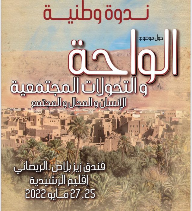 تنظم مؤسسة فكر للتنمية والثقافة والعلوم بشراكة مع جمعية جهات المغرب، وبتعاون مع وزارة التعليم العالي والبحث العلمي والابتكار، وقطاع الثقافة، وجامعة سيدي محمد بن عبد الله بفاس، وكلية الآداب والعلوم الانسانية بالرباط، والوكالة الوطنية لتنمية مناطق الواحات وشجر الأركان ووكالة التنمية الفلاحية، ندوةً وطنيةً حول موضوع: «الواحة و التحولات الاجتماعية،الإنسان، والمجال، والمجتمع» ذلك أيام 25 – 27 مايو 2022، بالمركز الثقافي بمدينة الريصاني، إقليم الرشيدية، يساهم في أشغالها مؤسسات، وأساتذة باحثون مختصون من مختلف الجامعات المغربية وخبراء وباحثون.
