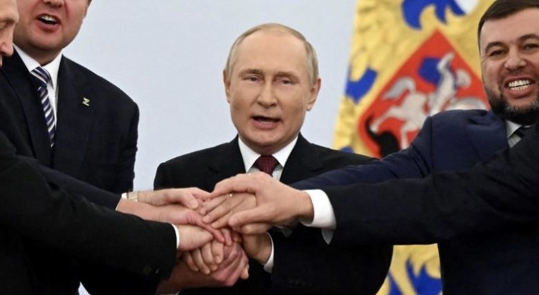 ووقع بوتين على اتفاقيات الضم إلى جانب زعماء المناطق الانفصالية في أوكرانيا، وهي دونيتسك ولوغانسك (شرق) ومقاطعتا زابوروجيا وخيرسون (جنوب) اللتان احتلتهما القوات الروسية خلال النزاع.