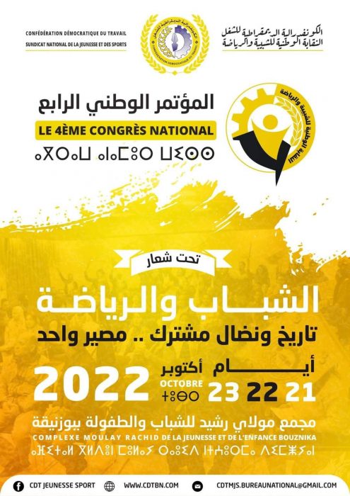 قرر كونفدراليو وكونفدراليات قطاع الشباب والرياضة عقد مؤتمرهم الوطني الرابع أيام الجمعة والسبت والأحد 21، 22، و23 أكتوبر الجاري بمركز بوزنيقة تحت شعار: الشباب والرياضة تاريخ ونضال مشترك …مصير واحد
