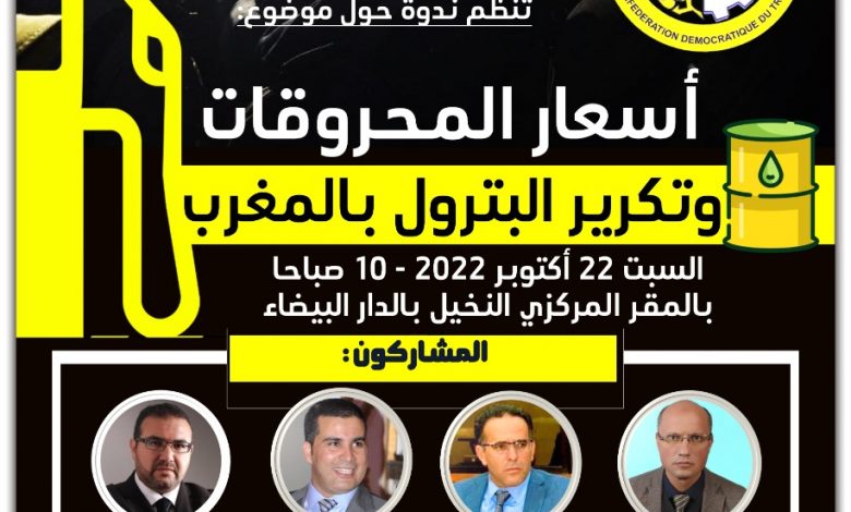 ينظم المكتب التنفيذي للكونفدرالية الديمقراطية للشغل، ندوة بمقرها المركزي بزنقة المرتضى بحي النخيل بالدار البيضاء، في 10 صباحا ليوم السبت 22 أكتوبر 2022، تحت عنوان “أسعار المحروقات وتكرير البترول بالمغرب“، من أجل توسيع المناقشات في الموضوع بين مختلف الأطراف والدفع لاتخاذ ما يلزم من القرارات والإجراءات الكفيلة بحماية القدرة الشرائية للمواطنين وخدمة الأمن الطاقي للمغرب في علاقته بملف أسعار المحروقات وقضية شركة سامير وتكرير البترول بالمغرب.