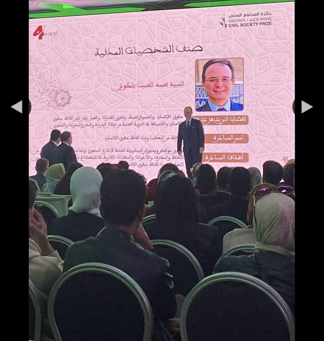توج محمد الحبيب بلكوش، بالجائزة الأولى في صنف الشخصيات المدنية، ضمن الجائزة الوطنية للمجتمع المدني في نسختها الرابعة التي جرت الخميس 22 دجنبر 2022 بالرباط.
