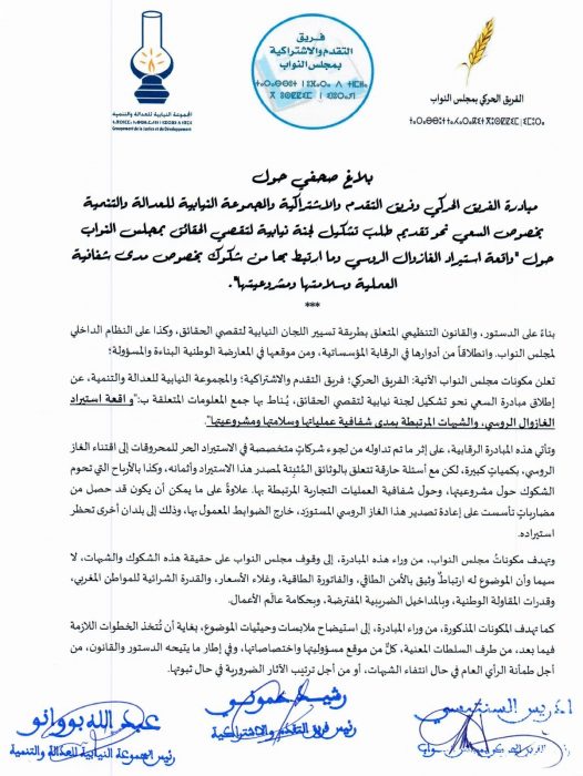 تعلن مكونات مجلس النواب الآتية: فريق التقدم والاشتراكية؛ الفريق الحركي؛ والمجموعة النيابية للعدالة والتنمية، عن إطلاق مبادرة السعي نحو تشكيل لجنة نيابية لتقصي الحقائق، يُــــناط بها جمع المعلومات المتعلقة ب:”واقعة استيراد الغازوال الروسي،والشبهات المرتبطة بمدى شفافية عملياتها وسلامتها ومشروعيتها”.