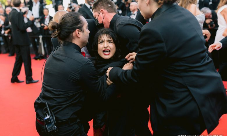 اقتحمت امرأة ترتدي فستانا بلوني العلم الأوكراني السجادة الحمراء في مهرجان كان السينمائي مساء الأحد، ثم سكبت على نفسها سائلا أحمر مشابه للدماء، قبل أن ي خرجها رجال الأمن من المكان.