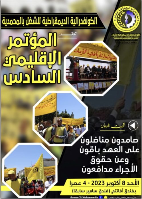 وقال بلاغ في الموضوع ان النقابة تهدف من خلال عقد هذه المحطة التنظيمية التي سيشارك فيها أكثر من 210 مؤتمر، الدراسة والتقييم للتجربة النقابية الكونفدرالية بالمحمدية، وتجديد التعاقد والعهد بين المناضلات والمناضلين بالمحمديةبانتخاب قيادة نقابية جديدة، تمثل القطاعات الأعضاء في النقابة، مع ضمان تمثيلية النساء والشباب، ورسم برنامج عمل للسنوات المقبلة، بغرض مواصلة مسيرة النضال والصمود، من أجل حماية مكتسبات الطبقة العاملة في القطاع الخاص والقطاع العام، والتصدي للتراجعات عن المكتسبات، وتحقيق المطالب المطروحة، ومنها أساسا التصدي لإغلاق المقاولات،وتشريد العمال، وإنقاذ شركة سامير المتوقفة عن الإنتاج،وحماية المصالح الوطنية للمغرب وحقوق العمال المرتبطة بوجودها، والحد من ضرب الحريات النقابية، وخرق مدونة الشغل وانتشار العمل خارج القانون والتهرب من الالتزامات القانونية في التغطية الاجتماعية (الصحة، التقاعد، فقدان الشغل، التعويضات العائلية..) وفي توفير شروط السلامة وحفظ الصحة وحماية أرواح العاملات والعمال في الوحدات الإنتاجية.