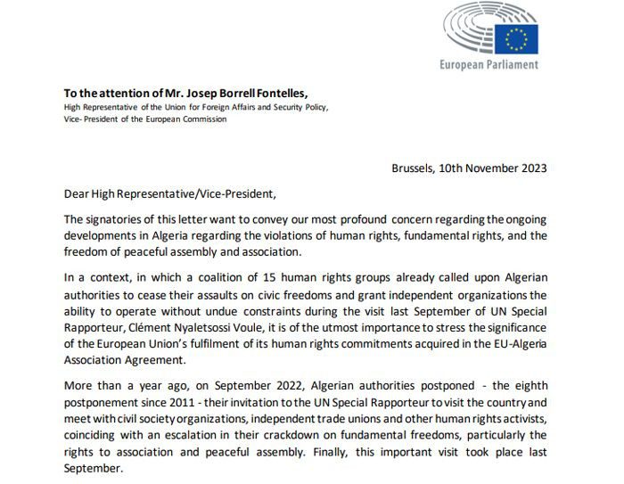 دعا أعضاء البرلمان الأوروبي من مختلف التيارات السياسية في رسالة موجهة إلى الممثل الأعلى للشؤون الخارجية والأمنية للاتحاد الأوروبي جوزيب بوريل، إلى اتخاذ إجراءات دبلوماسية عاجلة وقوية بحق النظام الجزائري بسبب استمراره في انتهاك حقوق الإنسان والتضييق على الحريات وممارسة قمع ممنهج بحق الجمعيات وهيئات المجتمع المدني.