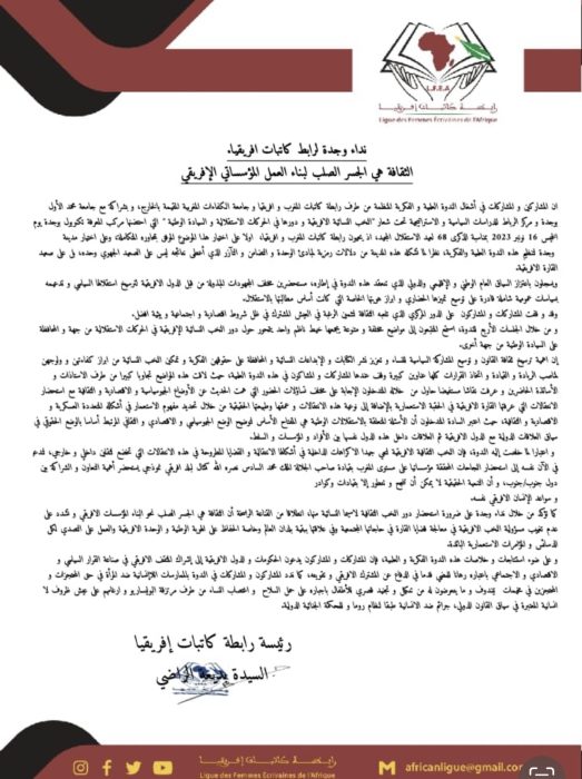 و على ضوء استنتاجات و خلاصات هذه الندوة الفكرية و العلمية، فإن المشاركات و المشاركون يدعون الحكومات و الدول الافريقية إلى إشراك المثقف الافريقي في صناعة القرار السياسي و الاقتصادي و الاجتماعي باعتباره رهانا للمضي قدما في الدفاع عن المشترك الافريقي و تقويته، كما ندد المشاركون و المشاركات في الندوة بالممارسات اللاإنسانية ضد المرأة في حق المحتجزات و المحتجزين في مخيمات تيندوف و ما يتعرضون له من تنكيل و تجنيد قصري للأطفال باجباره على حمل السلاح و اغتصاب النساء من طرف مرتزقة البوليساريو و ارغامهم على عيش ظروف لا انسانية المعتبرة في سياق القانون الدولي، جرائم ضد الانسانية طبقا لنظام روما و للمحكمة الجنائية الدولية.