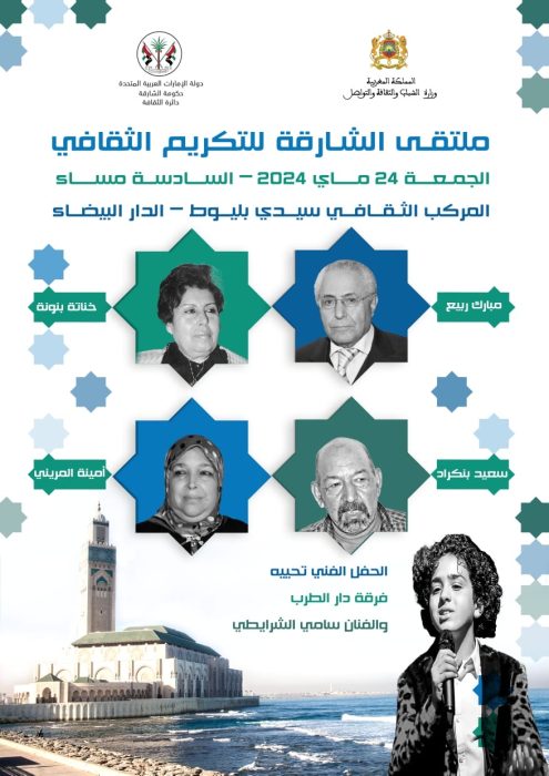 بتعاون مع وزارة الشباب والثقافة والتواصل في المملكة المغربية، تكرم دائرة الثقافة في حكومة الشارقة أربعة من أعلام وعلامات الثقافة المغربية، ضمن فعاليات الدورة 18 من ملتقى الشارقة للتكريم الثقافي، وذلك يوم الجمعة 24 ماي 2024، بالمركب الثقافي سيدي بليوط، بمدينة الدار البيضاء، ابتداء من الساعة السادسة مساء.