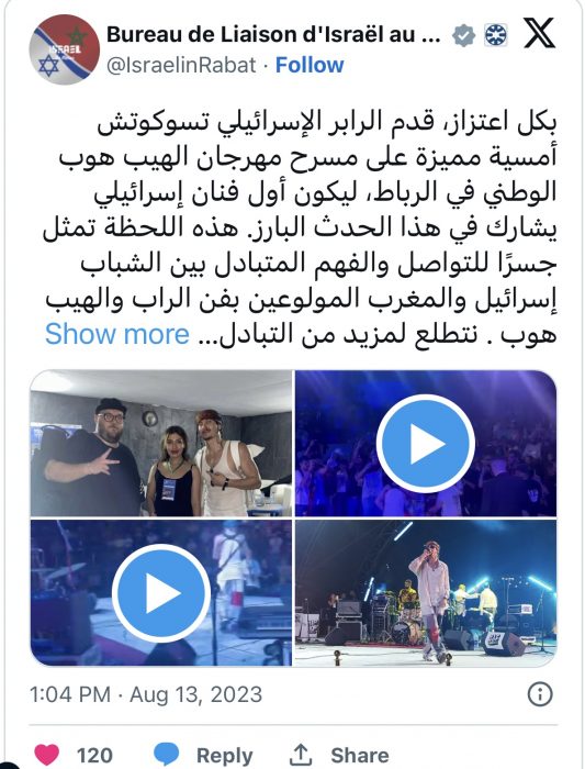 وأعرب رئيس المكتب إسرائيل بالرباط ” عن سعادته بالمشاركة الإسرائيلية ضمن فعاليات حدث فني بارز بالعاصمة المغربية الرباط، لأنها المرة الأولى التي يؤدي فيها مغني راب إسرائيلي أمام جمهور مغربي.