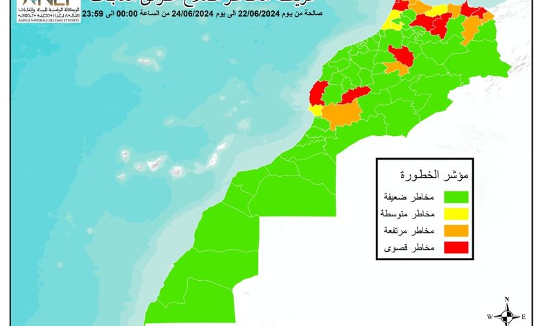 من أجل استباق ظاهرة حرائق الغابات على الصعيد الوطني، تصدر الوكالة الوطنية للمياه والغابات، وبشكل يومي، بناءاً على معطيات علمية، خرائط تنبؤ تحدد بدقة المناطق الحساسة والمعرضة لخطر اندلاع الحرائق الغابوية، ابتداءا من يوم السبت 22 يونيو 2024 إلى يوم الاثنين 24 يونيو 2024 وبعد تحليل البيانات المتعلقة خصوصا ب: