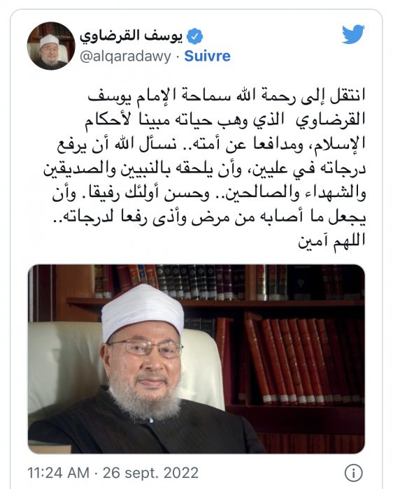 علم اليوم أن يوسف القرضاوي الرئيس السابق للاتحاد العالمي للمسلمين قد وفاته المنية اليوم حسب ما تم الاعلان عنه على صفحته الرسمية على تويتر