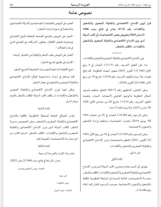 كما فوض نفس القرار لكاتب الدولة في الشغل مهام العمل على النهوض بالبرامج الخاصة المتعلقة بالنوع الاجتماعي ومحاربة تشغيل الأطفال، وتطوير الشراكات مع المجتمع المدني في هذه المجالات، والعمل على النهوض بطب الشغل والوقاية من المخاطر المهنية، وتتبع الأنظمة الداخلية للمؤسسات الخاضعة لتشريع الشغل، كما سيساهم في إعداد استراتيجية الوزارة الأم .