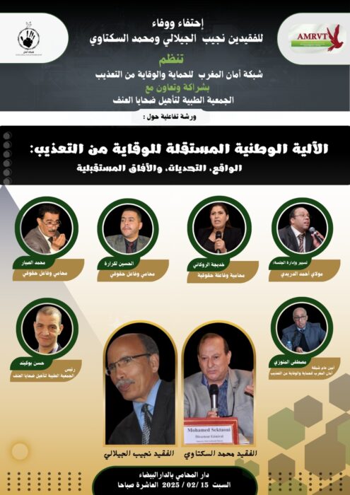 تأتي هذه الورشة حسب بلاغ في الموضوع في إطار تكريم الفقيدين البروفيسور نجيب الجيلالي والأستاذ محمد السكتاوي، تقديراً لإسهاماتهما في مجال حقوق الإنسان والتزامهما بمكافحة التعذيب وحماية الكرامة الإنسانية.