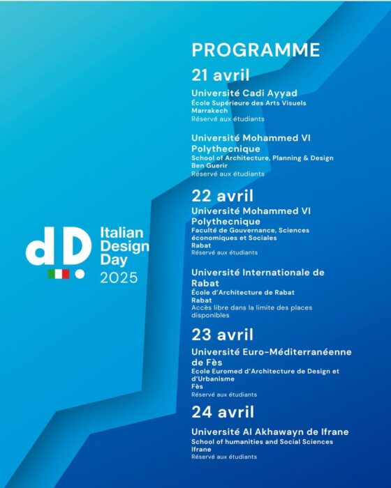 في سياق أنشطة ترويج “صُنع في إيطاليا” التي تقوم بها المؤسسات الإيطالية في المغرب، يسرني أن أُعلن عن انطلاق النسخة التاسعة من “يوم التصميم الإيطالي” في الفترة من 21 إلى 24 أبريل 2025، تحت شعار: