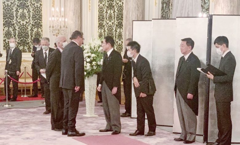 وعقب هذه المراسم، توجه رئيس الحكومة إلى قصر أكاساكا حيث قدم تعازي الملك إلى الوزير الأول الياباني، فوميو كيشيدا، وكذا إلى أرملة الراحل، أكي آبي.