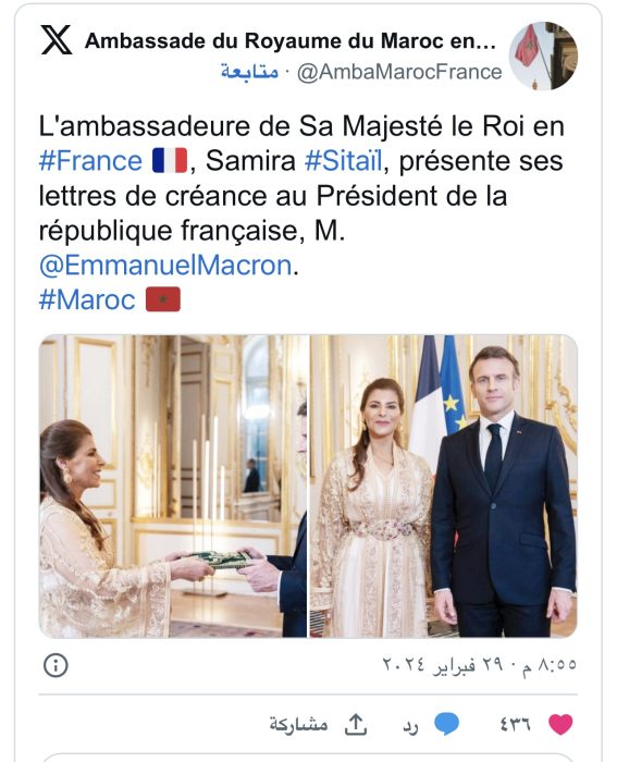 وكانت سيطايل، المديرة السابقة للأخبار في القناة الثانوية قد عيّنت يوم 30 نونبر المنصرم، سفيرة للمغرب بباريس.
