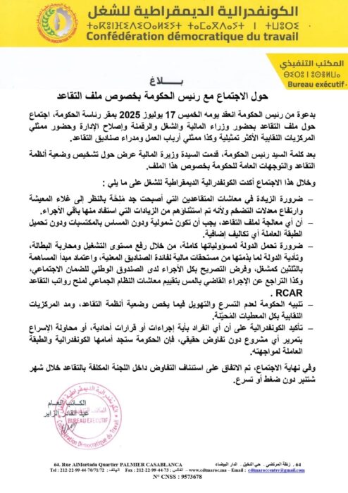 أصدرت الكونفدرالية الديمقراطية للشغل بلاغًا عقب اجتماع اللجنة الوطنية لمتابعة ملف التقاعد، الذي ترأسه رئيس الحكومة السيد عزيز أخنوش يوم الخميس 17 يوليوز 2025 بمقر رئاسة الحكومة.