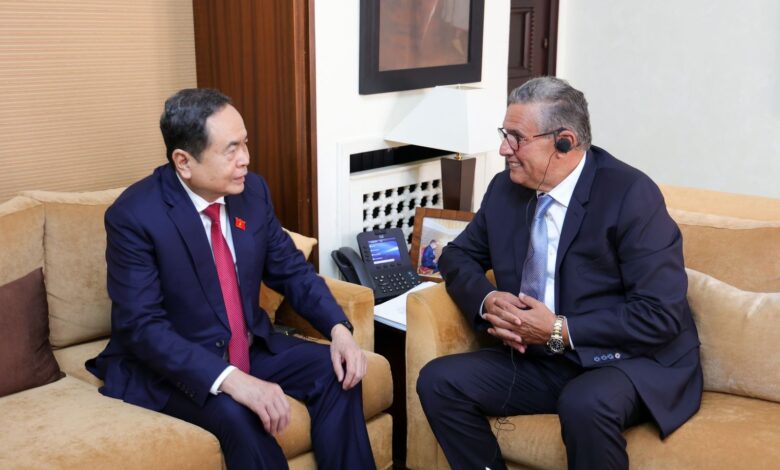 أجرى رئيس الحكومة، عزيز أخنوش، يوم الجمعة 25 يوليوز 2025 بالرباط، مباحثات مع رئيس الجمعية الوطنية لفيتنام، السيد تران ثانه مان، تم خلالها بحث سبل تعزيز التعاون الثنائي بين المغرب وفيتنام، بقيادة قائدي البلدين صاحب الجلالة الملك محمد السادس،، ورئيس جمهورية فيتنام الاشتراكية، السيد لونغ كوونغ.