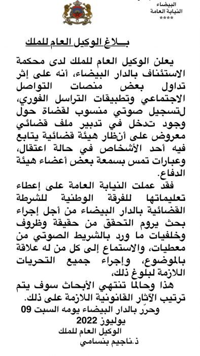 اعلن الوكيل العام للملك لدى محكمة الاستئناف بالدارالبيضاء انه على اثر تداول بعض منصات التواصل الاجتماعي وبعض تطبيقات الواتساب لتسجيل صوتي منسوب لقضاة حول وجود تدخل في تدبير ملف قضائي معروض على انظار هيئة قضائية يتابع فيها احد الاشخاص في حالة اعتقال وعبارات تمس بسمعة بعض اعضاء الدفاع .