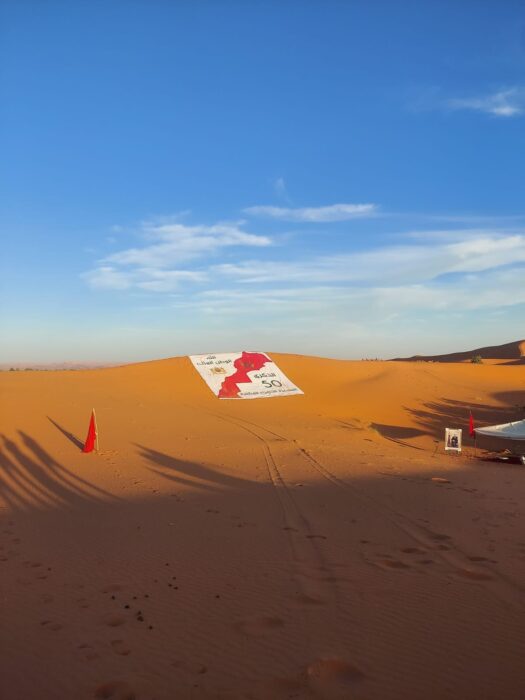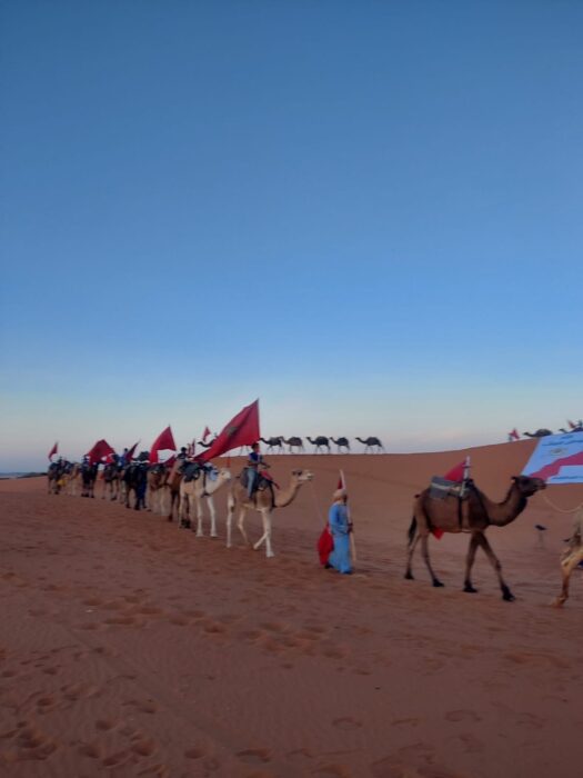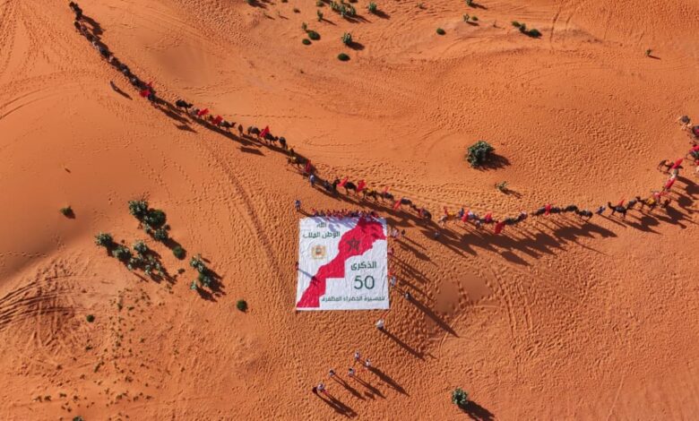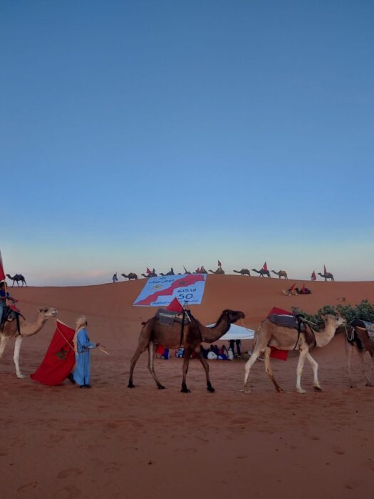 احتضنت الكثبان الرملية بمنطقة “إيرغ شبي” (Erg Chebbi) قرب مدينة الريصاني هذا الحدث الرمزي الفريد، الذي جمع بين الفرجة البصرية، الرسالة الوطنية، والإبداع الفني، حيث جابت خمسون جملاً رمال الصحراء في تشكيل فني بديع على هيئة خريطة المملكة المغربية، في إحالة بليغة إلى الوحدة الترابية للمغرب ومرور نصف قرن على ملحمة المسيرة الخضراء التي غيّرت مجرى التاريخ.