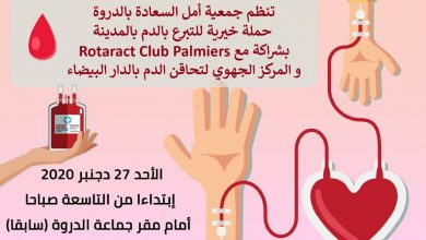 بشراكة مع Rotaract club Palmiers والمركز الجهوي لتحاقن الدم بالدارالبيضاء تنظم جمعية أمل السعادة بالدروة حملة خيرية للتبرع بالدم وذلك…
